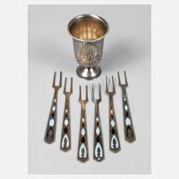 Becher, Anfang 20. Jh., gestempelt 84 Zolotniki, unleserliche Meistermarke, mit floralen und architektonischen Gravuren, die emaillierten Gabeln gestempelt 875 mit Hammer und Sichel, Herstellermarke LJuS, Griffe blau und schwarz emailliert, Reste alter Vergoldung, normale Altersspuren, G zusammen ca. 59 g.