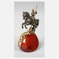 um 1920, Montierung aus bräunlich patinierter Bronze mit vollplastisch gearbeiteter Darstellung des Heiligen Georg beim Kampf gegen den Drachen, daran dreifach facettierter, drehbar gelagerter Karneol, ohne Monogramm, H 7 cm.