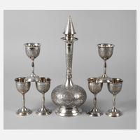 20. Jh., mit arabischen Schriftzeichen gestempelt, Silber geprüft, fein ziseliert und graviert nach altem Vorbild, dekoriert mit Vogelmotiven und Blüten, Karaffe mit kleiner Delle am bauchigen Korpus, H diese 27 cm, G zusammen ca. 708 g.