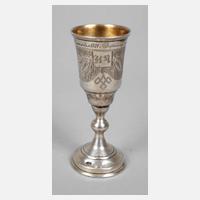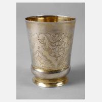 datiert 1881, Meisterpunze A.M., gestempelt 84 Zolotniki, innen vergoldet, schlanker Becher mit floraler Gravur und Umschrift, mit graviertem Besitzermonogramm und Umschrift, H 11 cm, G ca. 58 g.
