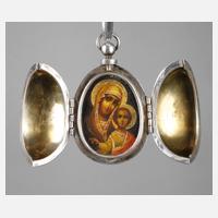Ende 19. Jh., Silber gestempelt 88 Zolotniki, kyrill. Meistermarke PO, aus massivem Silber gefertigtes Osterei an Hängeöse, mit scharnierter Front, hinter den aufklappbaren Viertelsegmenten liegendes, herausnehmbares, in Tempera ausgeführtes Andachtsbildchen der Muttergottes mit dem Christusknaben, min. Altersspuren, H 7 cm.