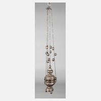 19. Jh., aus getriebenem Silberblech, mehrfach gepunzt 84 Zolotniki und kyrill. Meistermarke IA, an vier Gliederketten abgehängter zweiteiliger Korpus mit durchbrochen gearbeitetem, höhenverstellbarem Deckel, Ketten und Unterseite verziert mit abgehängten Glocken, Altersspuren, etwas gedellt, H 66 cm.