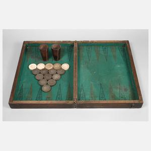 um 1920, langrechteckiger scharnierter Korpus, nussbaum- und buchefurniert, teils ebonisiert, Spielflächen für Schach und Backgammon, Innenseite mit grünem Filz ausgeschlagen, stärkere Alters- und Gebrauchsspuren, Maße 11,5 x 51,5 x 35,5 cm.