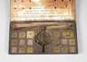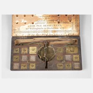 Deckel innen auf fragmentarisch erhaltener Verkleidung bezeichnet ...Waag und Gewicht ... Ihro Churfürstl. Durchl. zu Pfaltz... Joh. Pet. Braselmann, auf Wichlinghausen in Oberbarmen. 177... sowie handschriftliche Annotation mit Datierung 1779, Balkenwaage aus Eisen, runde Waagschalen und Gewichte aus Messing, elf eckige Münzgewichte mit entsprechender Maßangabe für Louis d'Or, Max d'Or, Pistole, Dukaten und Severin, Carlin, Gewichtssatz unvollständig, Alters- und Gebrauchsspuren, Waagengestell korrodiert, im hölzernen Etui, eine Schließe fehlt, L dieses 18 cm.