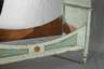 um 1800, Nadelholz massiv, beschnitzt und farbig gefasst, Kopfteil mit aufgesteckter Bekrönung, gemalte Darstellung Jesu mit flammendem Herz, Fußteil mit Landschaftsmalerei, originale Farbfassung mit stärkeren Alters- und Gebrauchsspuren, H 173 x B 98 x T 190 cm.