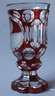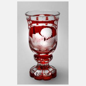 Mitte 19. Jh., farbloses Glas, reich geschliffen und rot gebeizt, Walzenschlifffuß, glockenförmige Kuppa, schauseitig eine Ovalkartusche mit Mattschnitt, wohl Darstellung des Schillerhauses in Weimar, geringe Altersspuren, H 15 cm.