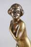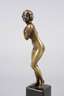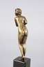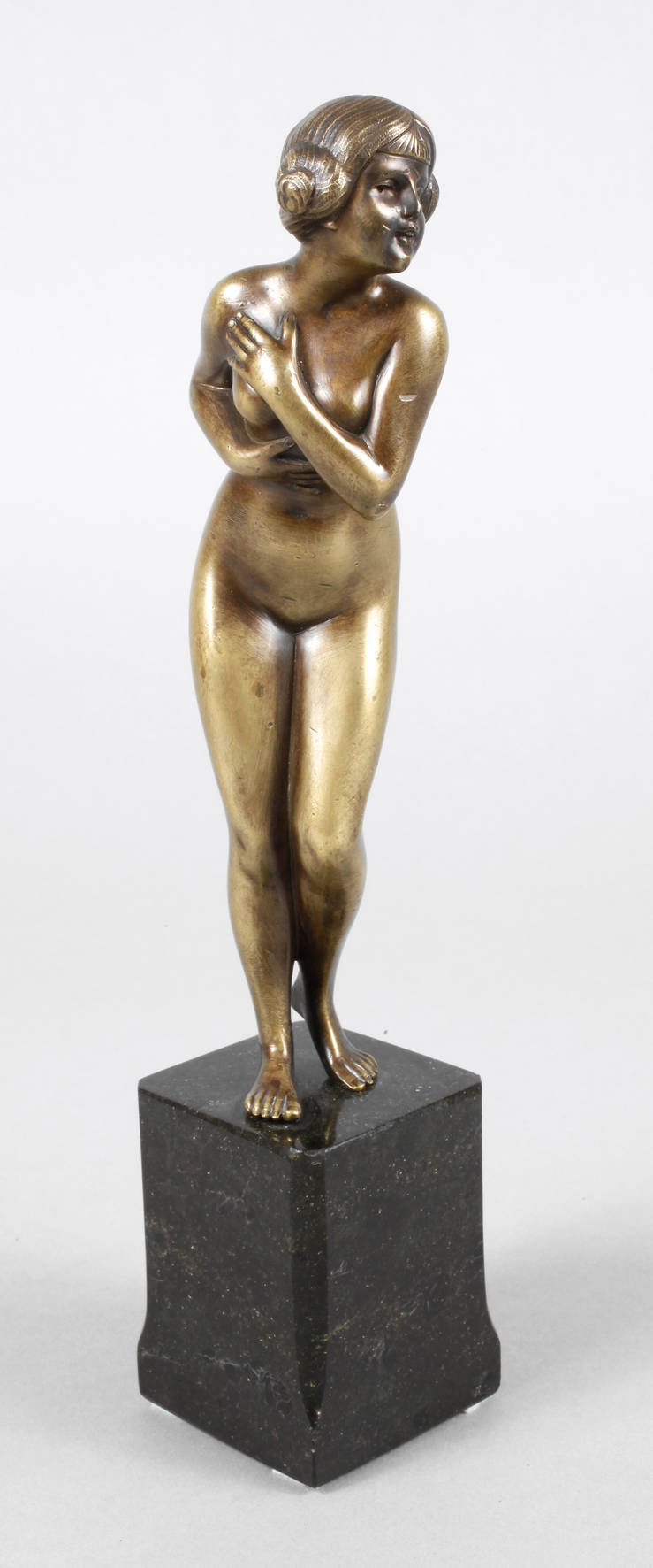 um 1910, unsigniert, Bronze hell bräunlich patiniert, stehendes nacktes Mädchen, sich schüchtern bedeckend, auf einem Sockel aus Granatserpentin mit abgeschrägten Kanten, minimal bestoßen, H Bronze 17 cm, H gesamt 23 cm.Künstlerinfo: Bildhauer in Berlin (1862 - 1935), war mit Porträtbüsten und Genrefiguren oft auf Berliner Ausstellungen vertreten (mehrere Akademieausstellungen, internationale Ausstellung 1891 und große Kunstausstellung 1893), beteiligte sich 1886 ohne Erfolg an der Konkurrenz um das Berliner Lessingdenkmal. Quelle: Thieme/Becke.
