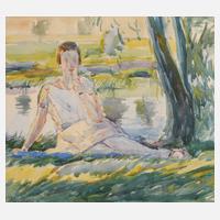 DIESES OBJEKT WURDE ZURÜCKGEZOGEN! weiß gekleidete Dame, auf einer blauen Decke, unter einem Baum am See sitzend, Aquarell, im unteren linken Bereich signiert und datiert „F. Neuenhahn, rückseitig Nachlassstempel „Kunstmaler Fritz Neuenhahn * Eisenach 04.03.1888 + Weimar 13.08.1947, Kunstschule Weimar, Schüler von L. v. Hofmann, Theodor Hagen, Max Thedy u. Sascha Schneider“, hinter Glas gerahmt, Falzmaß ca. 32 x 36 cm. Künstlerinfo: dt. Maler und Zeichner (1888 Eisenach bis 1947 Weimar), Studium an der Kunstschule Weimar bei Max Thedy, Ludwig von Hofmann, Sascha Schneider und Theodor Hagen, in Dressler auch als Bildhauer verzeichnet, Mitglied im Reichsverband Bildender Künstler, Quelle: Thieme-Becker, Vollmer, Dressler und Internet.