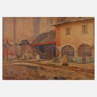 Blick über eine gepflasterte Straße auf eine Kirchenmauer mit Grabmal und Kruzifix, Aquarell, links unten signiert und datiert „I. Rupniewski (19)23“, gegilbt, unter Passepartout, hinter Glas gerahmt, Passepartoutausschnitt ca. 34,5 x 48,5 cm. Künstlerinfo: eigentlich Jerzy Mieczyslaw Rupniewski, polnischer Maler (1888 Warschau bis 1950 Swiecie), ab 1912 Studium an der Akademie der Künste in Warschau, 1917 erste Einzelausstellung, ab 1920 in Zalesie tätig, Studienreisen nach Italien und Deutschland, 1929–31 Vizepräsident und Präsident der Pommerschen Künstlervereinigung, ab 1947 lebte er in einem Krankenhaus für psychisch Kranke, Quelle: polnisches Wikipedia und Internet.
