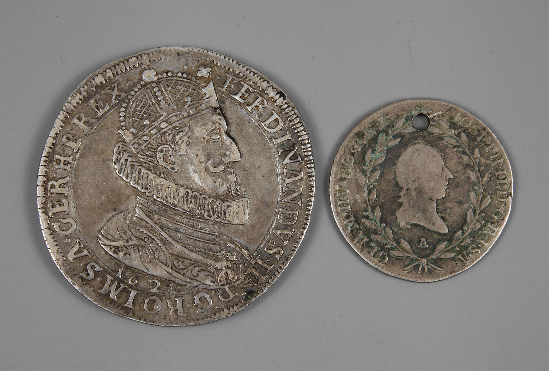 1) 1 Taler, 1621, Av. Ferdinand II., Rv. Doppeladler, ss, D 4,1 cm, G 27,6 g, 2) 20 Kreuzer, 1784, Av. Joseph II., Rv. Doppeladler, gelocht, ss, D 2,7 cm, G 6,3 g.