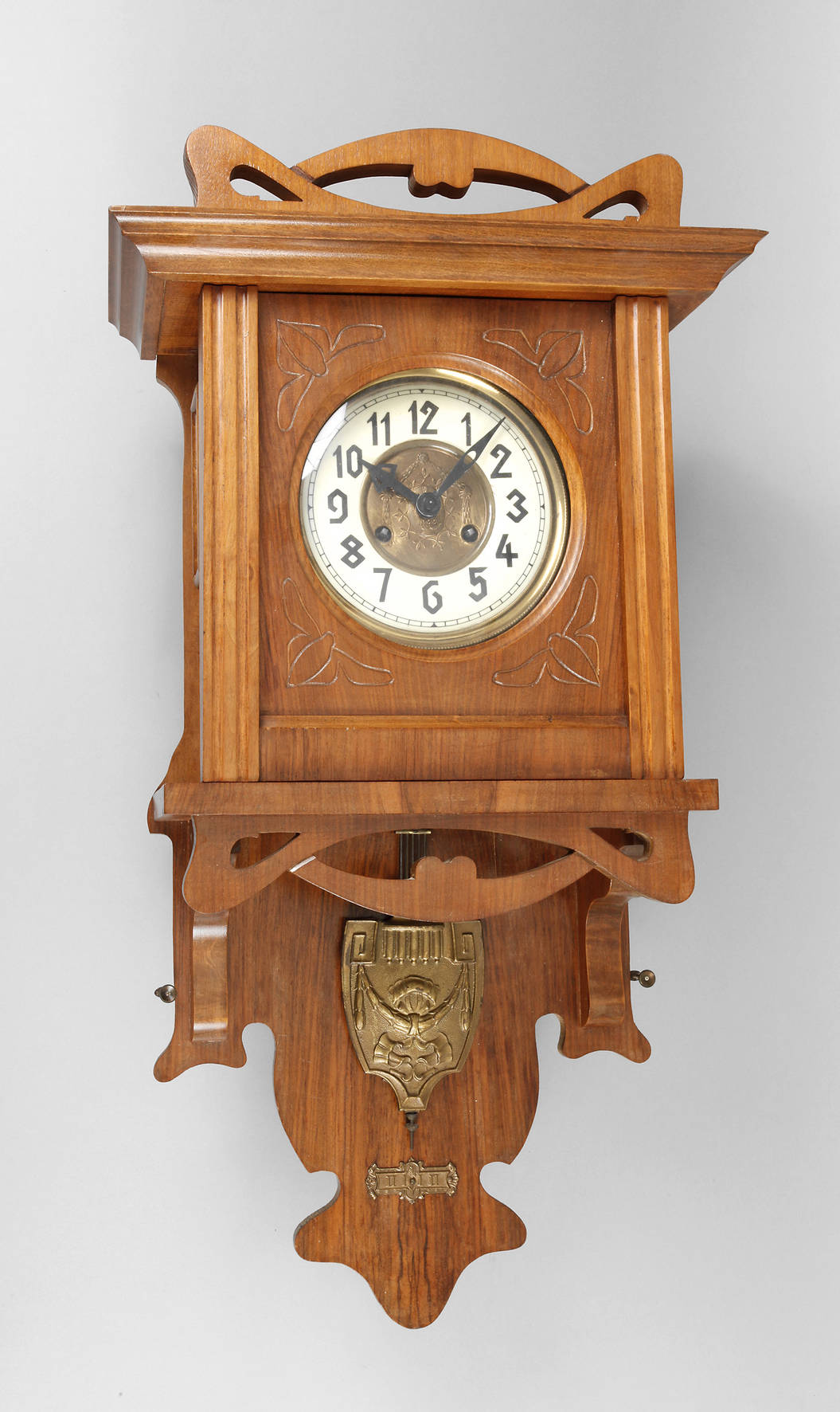 um 1900, gemarkt Non Plus Ultra, emaillierter Ziffernblattring mit arabischen Zahlen, Ziffernblatt und Pendel mit reliefierten klassizistischen Motiven, Nussbaum furnierter Korpus mit originaler Bekrönung, funktionstüchtig, H 75 cm.