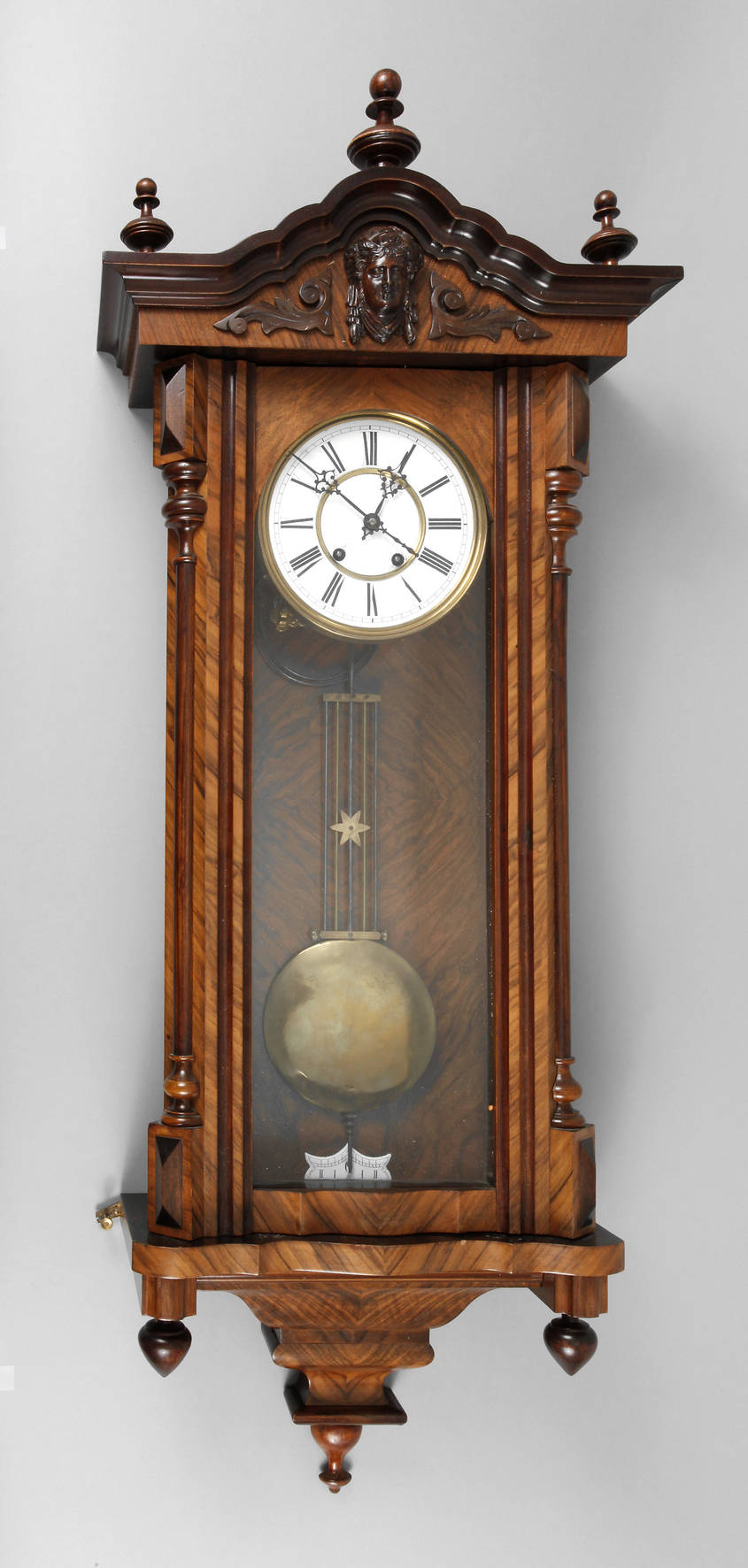 um 1880, Werk bezeichnet ”Fabrikmarke CW”, feines emailliertes Ziffernblatt mit römischen Zahlen, Halbstundenschlag auf Tonfeder, Nußbaum furniertes Gehäuse mit Frauenkopf verziert, alle Zierteile vorhanden, ein Zapfen lose, sonst guter Zustand, funktionstüchtig, H 110 cm.