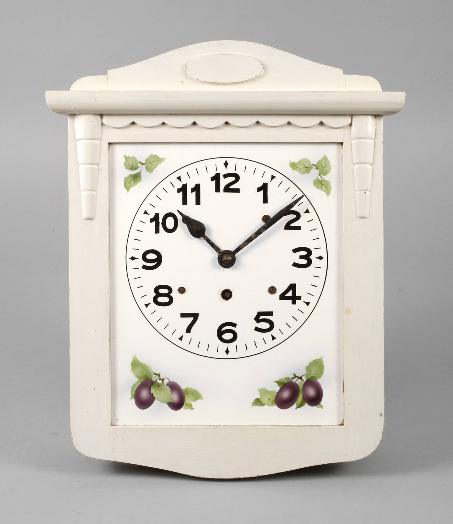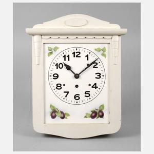 um 1920, ungmarkt, Front aus Keramik mit aufgedrucktem Pflaumendekor, weiß lackierte Holzeinfassung, einfaches Messingpendulenwerk, mit Schlüssel, Werk läuft, H 40 cm.