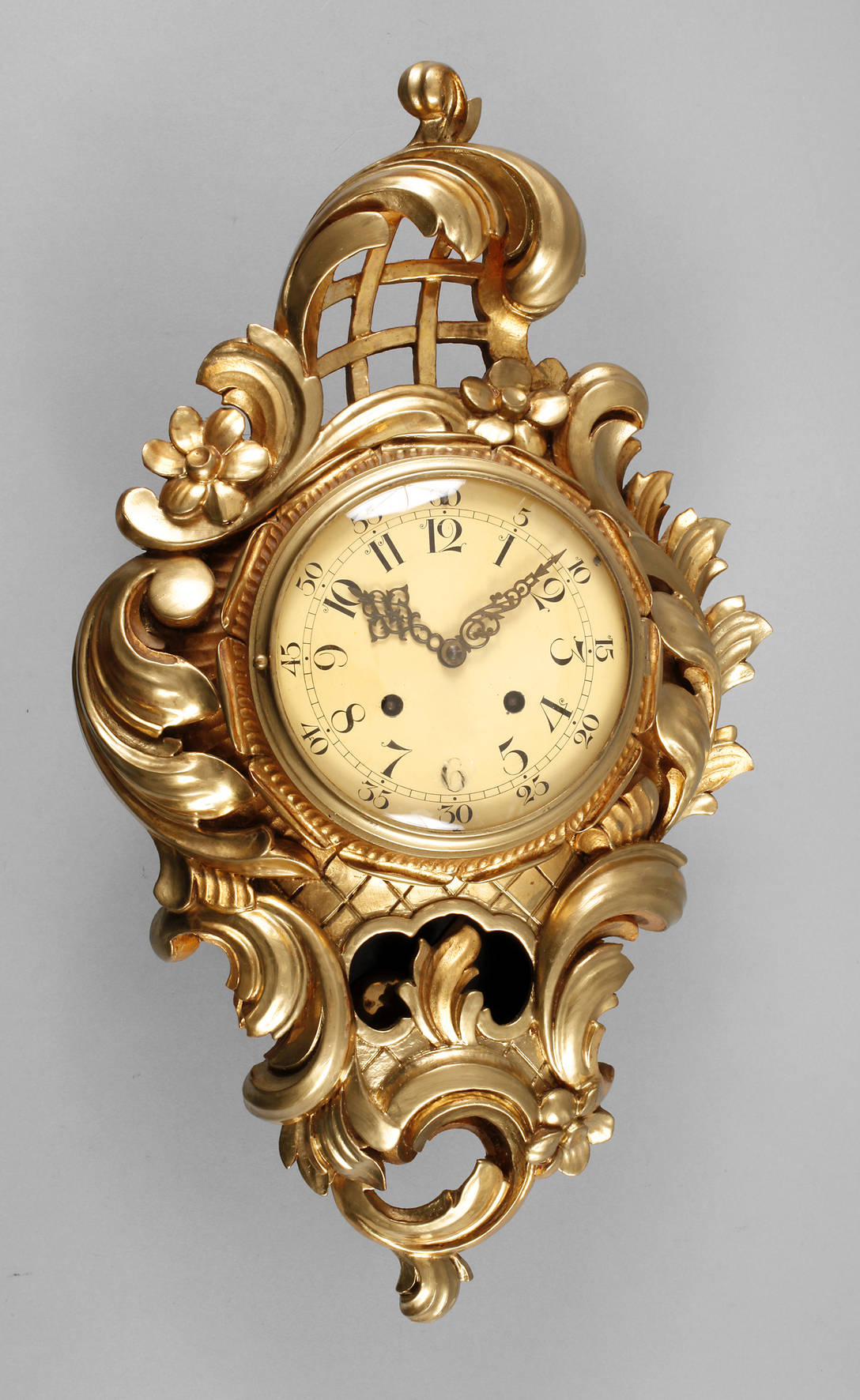 Skandinavien um 1930, Holz geschnitzt und vergoldet, im Rokokostil gearbeitete Wanduhr mit Messingpendulenwerk, Halbstundenschlag auf Glocke, sichtbares Pendel, Metallziffernblatt mit arabischen Zahlen, funktionstüchtig, mit Schlüssel, L 60 cm.