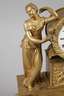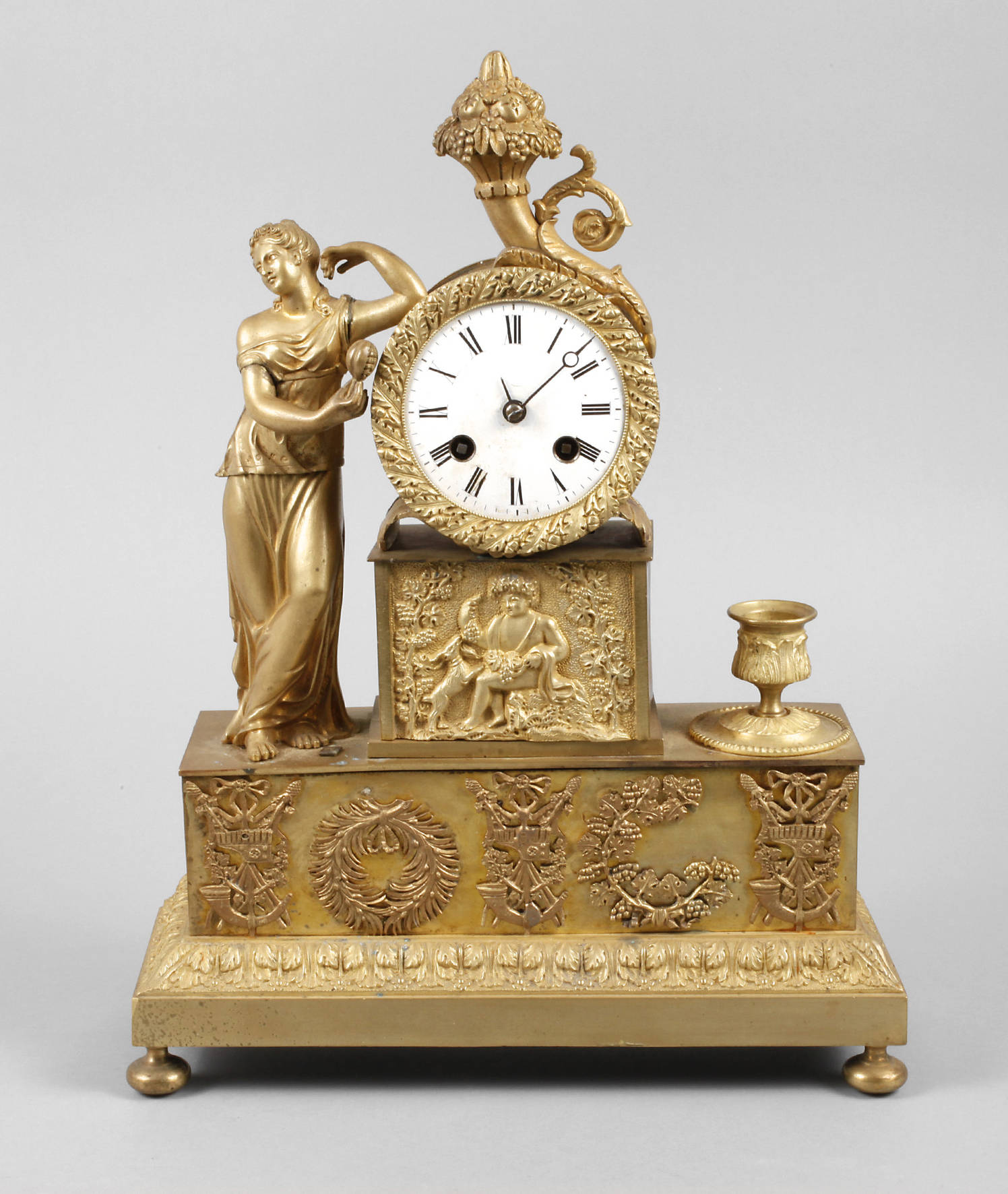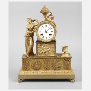 Frankreich Anfang 19. Jh., mehrteilig gegossen und verschraubt, vergoldet, figürliche Darstellung nach römischem Vorbild, seitlich Kerzenständer, mit späterem Uhrwerk um 1900, signiert Samuel Marti, Verschraubung am Werk lose, Werk läuft, ohne Schlüssel, H 40 cm.