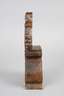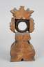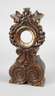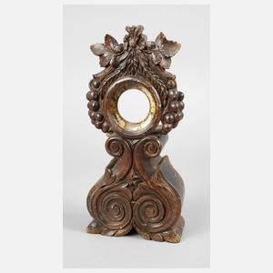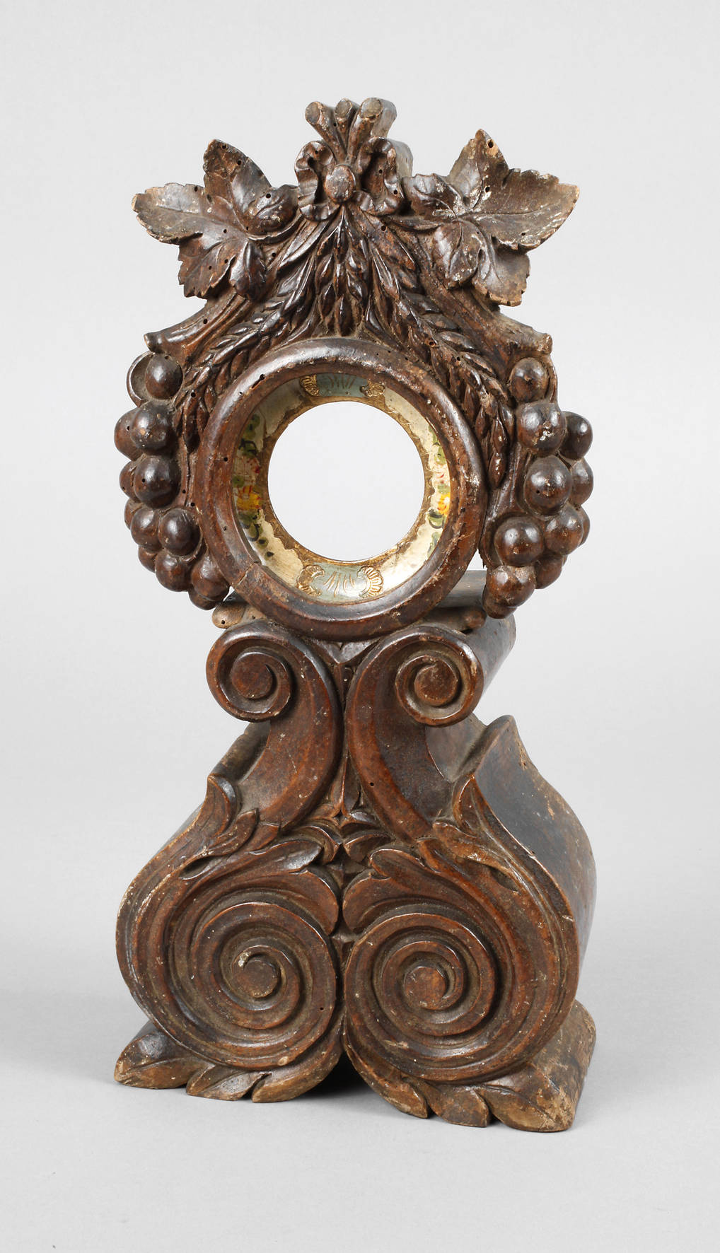 Ende 18. Jh., Holz geschnitzt, Fuß mit zwei Voluten verziert, das Ziffernblatt umgeben von Traubengehänge und Kornähren, der innere Ring graviert und fein bemalt, partiell vergoldet, rückseitig Möglichkeit zur Aufhängung einer Taschenuhr sowie kleine Konsole für rechteckiges Uhrwerk, unrestaurierter Originalzustand, D innen 52mm, H 33 cm.