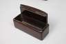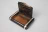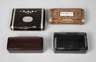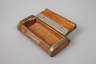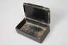 19/20. Jh., drei Lackschatullen, eine davon mit Ziereinlagen aus Nickel, dazu geschnitztes Modell mit geprägter Lederummantelung und Besitzername Josef Büttner, unterschiedliche Maße und Erhaltungen, L max. 11 cm.