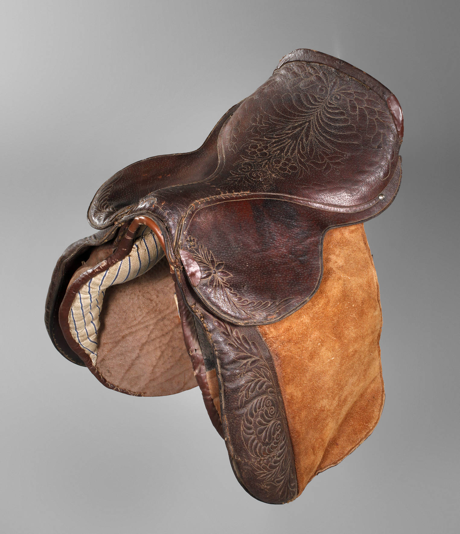 19. Jh., dunkelbraunes Leder mit abgestepptem floralen Dekor, stark ausgearbeitete Sitzmulde und gepolsterte Pauschen, Alters- und Gebrauchsspuren, H 50 x B 40 x T 44 cm.