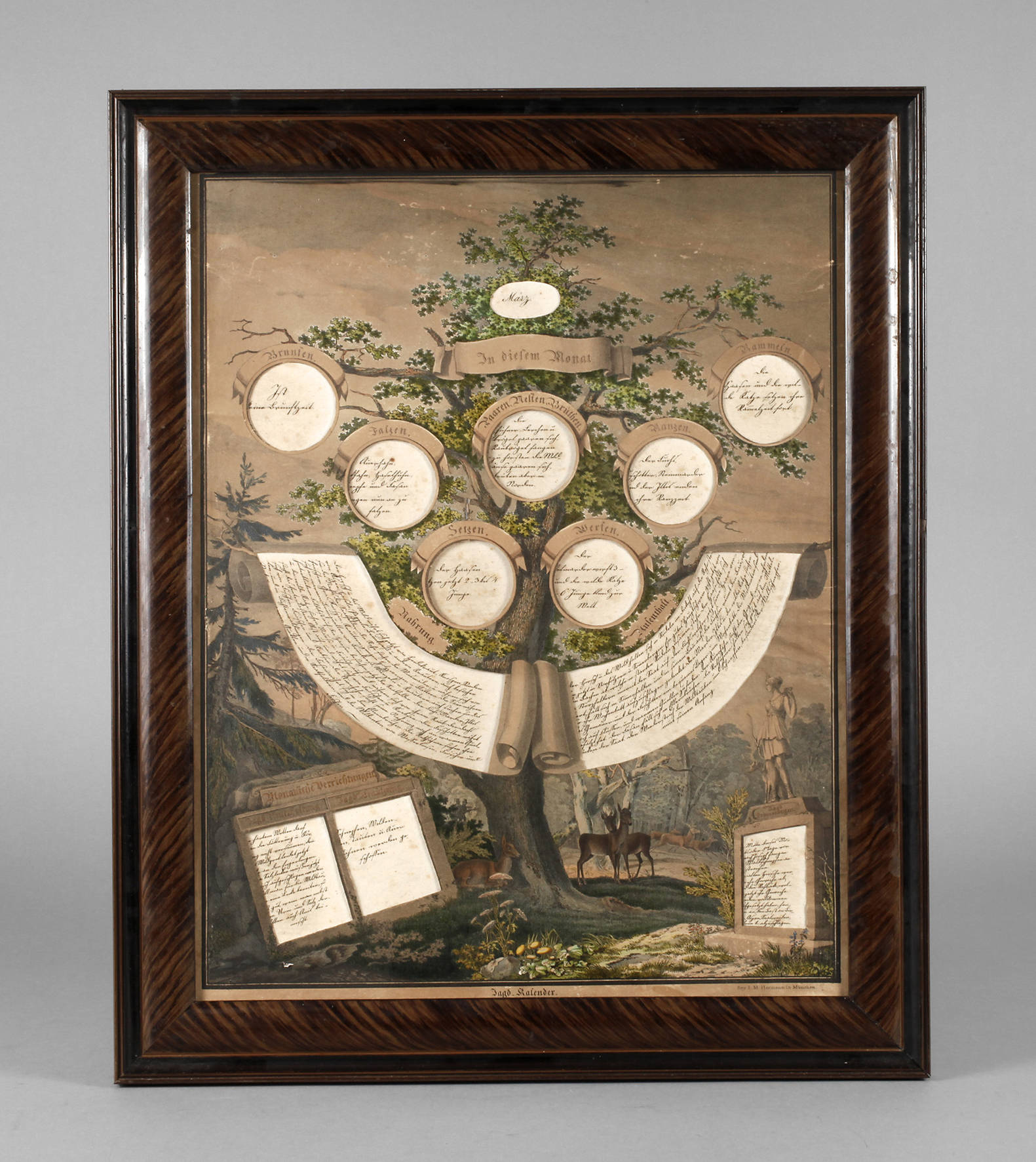 um 1890, Druckvermerk Bey I. M. Hermann in München, Farblithografie auf Papier, durchbrochen gearbeitetes Deckblatt mit Fenstern für Angaben wie Haaren, Nästen, Brüten, Rammeln, Ranzen, Werfen etc., komplett für alle Monate, hinter Glas, in schlichter Holzleiste gerahmt, leichte Erhaltungsmängel, Maße 59 x 49 cm.