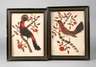 Darstellung zweier auf Ästen sitzender, exotischer Vögel, dekorative Collagen aus Federn in kraftvoller Farbigkeit mit eingesetzten Glasaugen, um 1880, Erhaltungsmängel, hinter Glas als Pendants gerahmt, Falzmaß je ca. 31,5 x 24 cm.