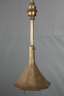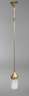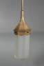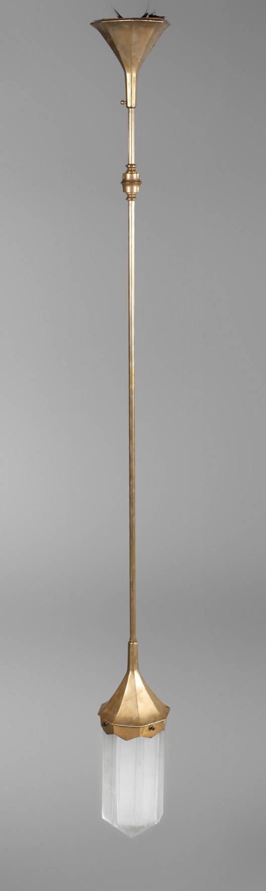 um 1925, überlanges schlankes Messinggestänge mit abgehängtem facettierten Baldachin, daran satinierter, im Rippenmodel formgeblasener Klarglasschirm, H 155 cm, D ca. 15 cm.