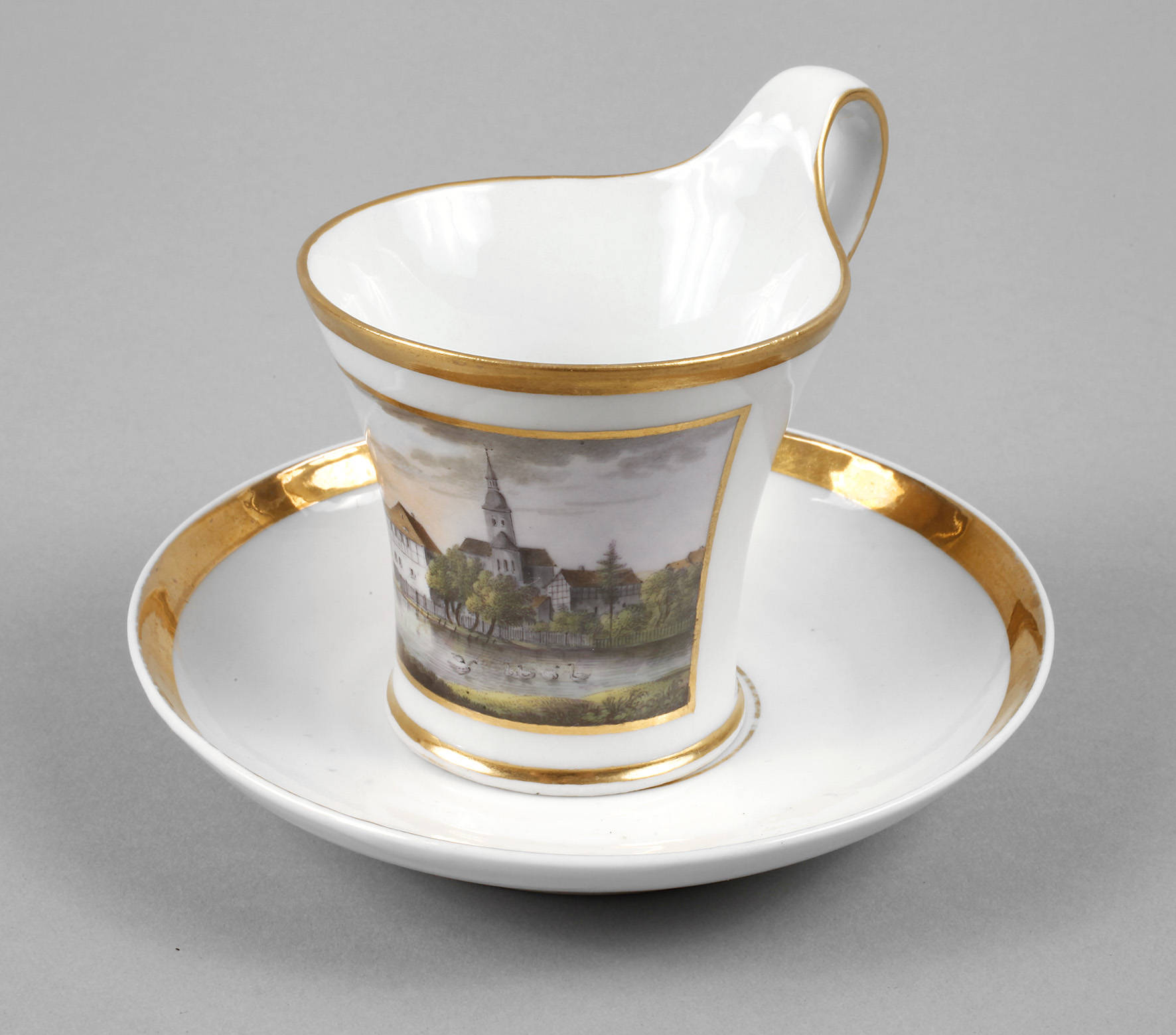 unterglasurblaue Zeptermarke, 1790er Jahre, Tasse in Kalathosform mit Campanerhenkel, Goldstaffage, schauseitig Rechteckkartusche mit feiner polychromer Vedutenmalerei, wohl Ansicht Wolfenbüttel mit Kirche und Schwänen auf Gewässer, passende Untertasse ungemarkt, Untertasse minimal berieben und brandfleckig, H gesamt 9,5 cm.