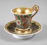 um 1820, rote Pinselmarke BS à Paris, leicht ausgestellter Fuß, Tasse in Glockenform mit hochgezogenem Volutenhenkel, innen ein stilisierter Tierkopf, umlaufendes Blumendekor mit einem Tuch gedrückt, innen fast komplett vergoldet, etwas berieben, H 12 cm.