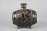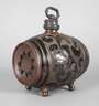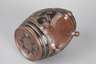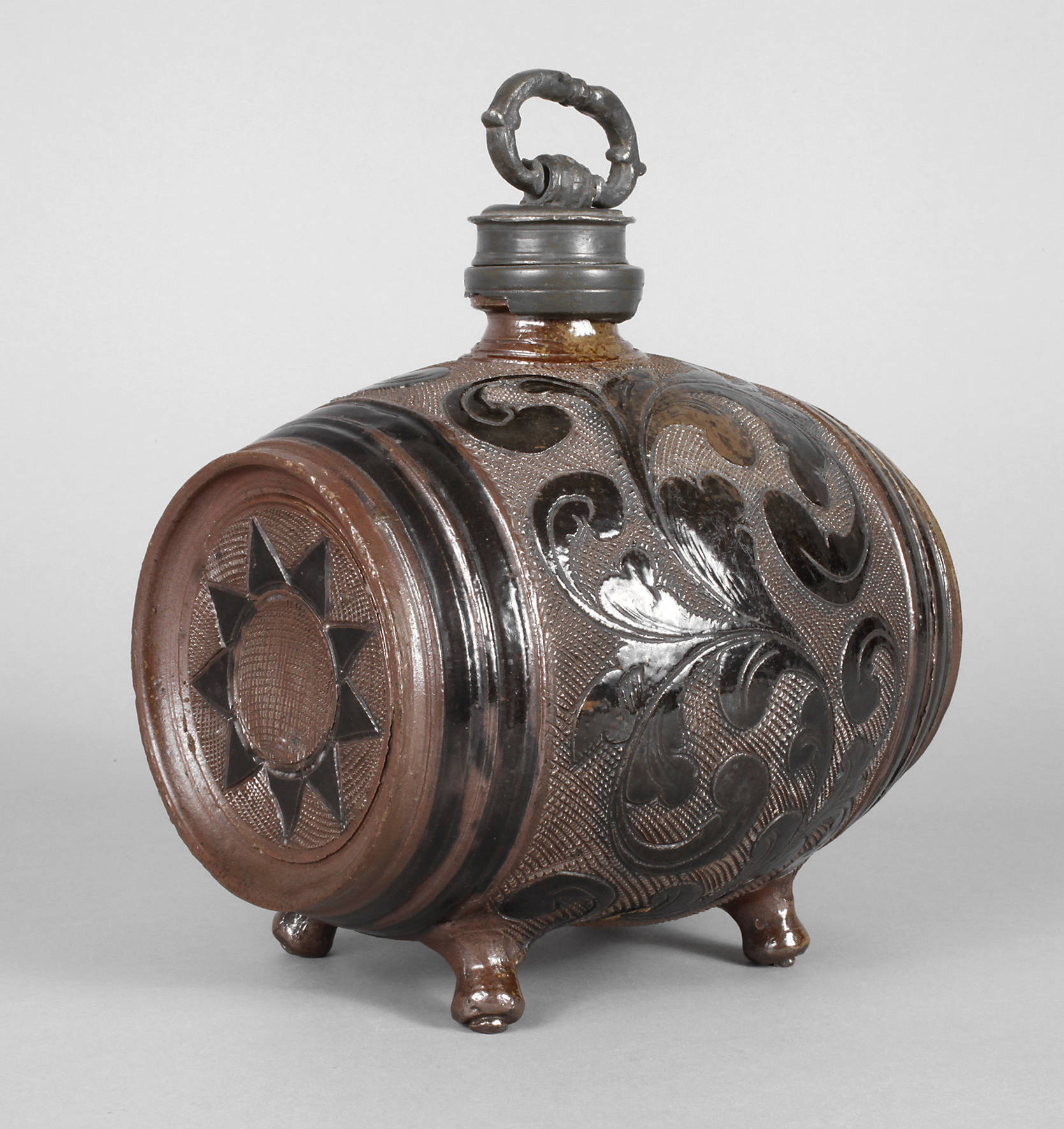 um 1670/75, braunes Feinsteinzeug mit schwarz-braun engobierten Pflanzenmotiven auf kreuzgekämmter Oberfläche, seitlich Sterne, auf vier Kugelfüßen stehend, schraubbarer Zinndeckel mit Klappgriff, unter der Zinnmontur eine kaum zu sehende Fehlstelle, nicht sichtbar fachgerecht restauriert, Fehlstelle am Zinn, L 20 cm. Quelle: Joseph Horschik, Steinzeug von Bürgel bis Muskau, 15.–19. Jh., S. 334, Nr. 235, dort Fass mit leicht anderem Floraldekor.