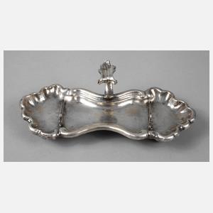 gepunzt Johann Erhard Wegelin, Meister ab 1762, Augsburger Zirbelnuss mit Buchstabe Q, um 1763–1765, nierenförmiges Schälchen mit akanthusblattverzierter Handhabe, altersgemäßer Zustand mit leichten Gebrauchsspuren, L 18 cm, G ca. 169 g. Quelle: Helmut Seling, Die Kunst der Augsburger Goldschmiede, Band III, S. 407, Nr. 2481.