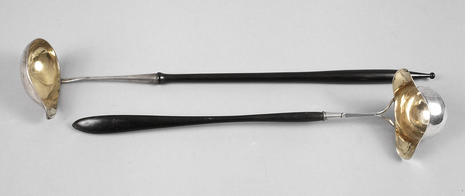eine gestempelt 12 Lot mit Hersteller R, die andere mit unleserlicher Tierpunze sowie JCM & C, Silber mit vergoldeten Laffen, lange Ebenholzstiele, dem Alter entsprechend gute Erhaltung mit wenig Gebrauchsspuren, L 40 und 46 cm.