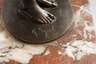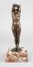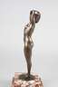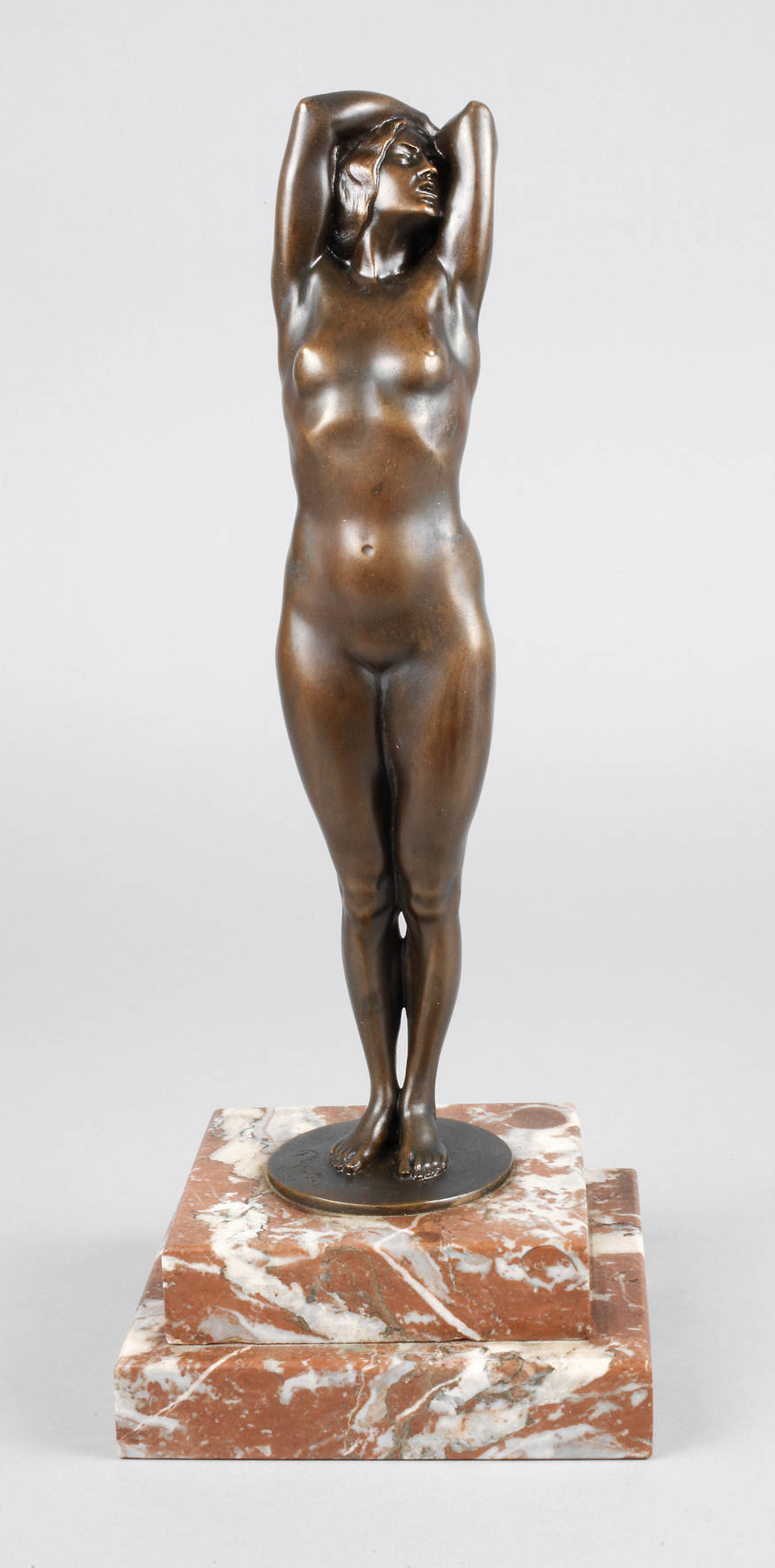 auf der Plinthe datiert 1910 und unleserlich signiert F. Grothe?, weiteres Monogramm MPu. ligiert, Metallguss dunkel patiniert, Aktdarstellung einer schönen jungen Frau mit erhobenen Armen, die Hände in ihrem Haar, auf flacher runder Plinthe, auf mehrteiligen Marmorsockel montiert, gute Erhaltung, H Skulptur 32 cm, H gesamt 39 cm.