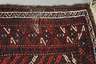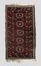 um 1920, cremefarbener geometrischer Dekor über dunkelrotem Fond, mehrteilige umlaufende Bordüren, Randbeschädigungen, kleiner Riss in der Außenbordüre, Maße 173 x 92 cm.