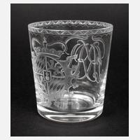 2. Hälfte 19. Jh., gravierte Signatur, farbloses Glas formgeblasen, konische Form, schauseitig bayerisches Wappen mit Kurfürstenhut, rückseitig Ligaturmonogramm, am Lippenrand ein umlaufendes Ornamentband, sehr gute Erhaltung, H 9 cm.