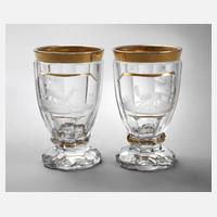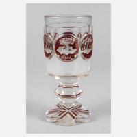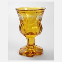 1. Hälfte 19. Jh., klares Glas, Walzenschlifffuß mit Kerbschnitt, partiell violett gebeizt, mattgeschnittene Kartuschen mit verschiedenen Darstellungen, Aufschrift: Gesundheit, Glück und Freude, ohne Monogramm, starke Gebrauchs- und Altersspuren, am Fuß viele kleinere Beschädigungen, H 16 cm.