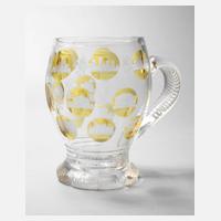 um 1790, klares Glas, ausgekugelter Abriss, der Boden mit einer schön geschliffenen Rosette verziert, wulstiger Stand, Zylinderform, angesetzter Henkel mit unten eingerolltem Rand, mattgeschliffen und teilpoliert, mittig bekröntes Adelswappen mit Monogramm und Gitterdekor, Füllhörnern und Festons, am Stand umlaufend Palmetten, am Lippenrand ein Perlband in Kugelschliff, altersgemäße, normale Gebrauchsspuren mit leichten Kratzern, das Glas mit winzigen Einschlüssen, sonst jedoch unbeschädigter guter Zustand, H 16,5 cm.