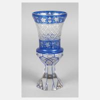 1. Hälfte 19. Jh., klares Glas, plangeschliffener Stand, reich dekoriert in verschiedenen Schliffarten, partiell blau gebeizt, umlaufende Weinlaubranken, etwas berieben mit Altersspuren, sonst jedoch unbeschädigt, H 27 cm. .