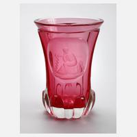1. Hälfte 19. Jh., roséfarbenes Glas, ausgekugelter Abriss, facettiert, am Stand gebuckelt, der Boden mit Kerbschliff, schauseitig eine gewölbte Ovalkartusche mit feinem Mattschliff, Darstellung eines Gelehrten mit Äskulapstab, rückseitig: Andenken von A.S., am Lippenrand eine winzigste Kerbe, H 13,5 cm.