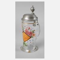 Zinndeckel gepunzt Friedrich Traugott Günther/Freiberg, datiert 1840, Besitzermonogramm J.E.F.O., farbloses Glas, von innen und außen bemalt, mit buntem Emailfarben und Gold, Spruch: ”Nim dieses Glas von mier trink daraus das Kindtaufen Bier”, frei geformter und angesetzter Henkel, blasiger Abriss, Stand mit alter Restaurierung an einer Luftblase, H 25,5 cm.