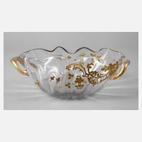 um 1870/80, gemalte Signatur im ausgekugelten Abriss sowie eine Reliefsignatur auf einer Glaspastille, violettes Glas mit frei geformten, angesetzten und gekniffenen Applikationen, der Mündungsrand dreifach heruntergezogen, mit bunten Emailfarben geometrisch und floral bemalt, reich vergoldet, altersgemäßer guter Zustand, D 28 cm. Quelle: Glasmarkenlexikon, Carolus Harmann, S. 657.