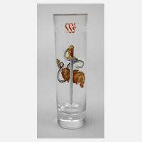 um 1900, farbloses Glas, plangeschliffener Stand, Boden mit eingestochenem Luftblasendekor, Zylinderform mit Goldrand, emailliert Schwert, Schlange und Wedel, Spruch: Wer mich lobt in ”Präsentia” und mich schilt in ”Absentia” den hol die ”Pestilentia”, Lippenrand etwas berieben, H 19,5 cm.