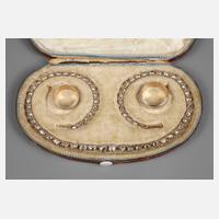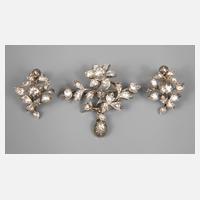 Anfang 19. Jh., Silber und Gelbgold 585/1000 geprüft, bestehend aus Brosche von 36 x 37 mm und Paar Ohrringen von 23 x 17 mm, jeweils in Form eines Astes mit Blüten und Blättern, besetzt mit 47 Diamantrosen von max. 5 x 4 mm, leichte Tragespuren, G. ges. ca. 12,3 g.