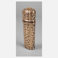18./19. Jh. Stein und rötliches Gelbgold geprüft 585/1000, über aufwendig geschnittenem Steinkorpus feine, durchbrochene Goldschmiedearbeit mit Rocaillen, Blüten und Vögeln, Verschlussknopf mit Diamantrose besetzt sowie Öse für Aufhängung an Kette, Verschluss schließt nicht, sonst guter Erhaltungszustand, Maße 95 x 38 x 22 mm, G ca. 85,7 g.