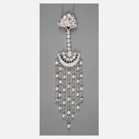 Ende 20. Jh., Weißgold geprüft 585/1000, vollflächig besetzt mit zahlreichen Brillanten von zusammen ca. 0,5 ct, L ca. 48 mm, an ca. 45 cm langer Fuchsschwanzkette mit Karabinerverschluss, Platin gestempelt 950, G gesamt ca. 11,8 g, passend zu Katalog-Nr. 1430.