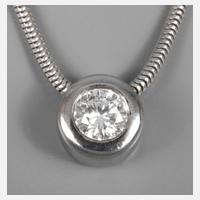 Ende 20. Jh., Weißgold gestempelt 585, besetzt mit einem Brillanten, Farbe Top Wesselton, Reinheit Very Small Inclusions, in Zargenfassung, an ca. 40 cm langer Schlangenkette, G gesamt ca. 6 g, passend zu Katalog-Nr. 1432.