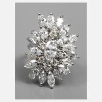 2. Hälfte 20. Jh., Weißgold geprüft 585/1000, ca. 27 mm hoher Ringkopf, vollflächig besetzt mit Diamantnavetten und Brillanten von bis zu ca. 0,5 ct, von zusammen ca. 4 ct in guter Qualität und verschiedener Farbnuancen, RW 16 mm, G ca. 8,3 g.