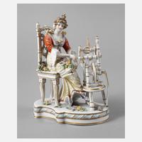 unterglasurblaue Linienmarke 1887–1900, polychrome Aufglasurbemalung und Goldstaffage, auf geschweifter Plinthe am Spinnrad sitzende Dame, verziert mit plastischen Blüten, H 17 cm.