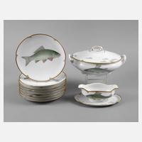 für acht Personen, grüne Stempelmarke 1904 und 1906, Modellnummer 2312, mit passig geschweiftem Rand, grünbrauner Fischdekor und Goldränder, bestehend aus Deckelterrine, Sauciere und acht Tellern, davon einer haarrissig, L Terrine 29 cm.