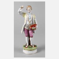 unterglasurblaue Stempelmarke mit Zusatz 1882 ab 1990, Modellnummer 9099, polychrome Aufglasurbemalung und Goldstaffage, feiner Herr in Rokokokleidung, mit erhobenem Arm, auf Rundsockel mit Blütenbesatz und Baumstütze stehend, H 20,5 cm.