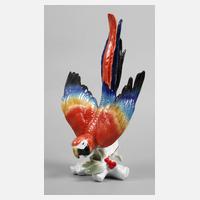 Firma Karl Ens, Mitte 20 Jh., grüne Stempelmarke, 1. Drittel 20. Jh., Modellnummer 7118, naturalistische Ausformung mit polychromer Unterglasurbemalung, nach Früchten herabstürzender Papagei über Astsockel, H 36 cm.