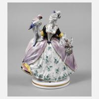 Entwurf wohl Arthur Storch um 1920, Ausführung Karl Ens, grüne Mühlenmarke ab 1919, Zusatzstempel Ens-Porzellan Volkstedt sowie handgemalt, Modellnummer 4842 7, naturalistische Ausformung mit polychromer Bemalung und Goldstaffage, auf Rundsockel stehende Frau im Krinolinenkleid, dem Papagei in ihrer rechten Hand zugewandt, in der anderen Hand eine Pompadourtasche und Stock haltend, H 24 cm.